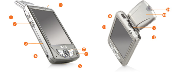 | 1.Power Button 2.Record Button 3.Reset Button 4.Headphone Jack 5.Active Sync Connector 6.Speaker 7.Navigation Stick | 8.LED Indicator 9.IR Port 10.Touch Screen 11.Stylus Pen 12.SD/MMC Card Slot 13.GPS Antenna 14.Car Antenna Connector |