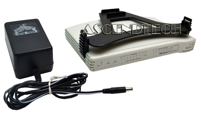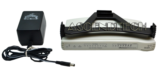 Genuine Original 3 COM Office Connect 8-Port Ethernet Hub with AC Power Adapter and Fastening Piece 8C 1670-110-050-3.00 3C16701A. The OfficeConnect series is a group of hubs that have been optimized and designed for small Ethernet workgroups. The OfficeConnect hub 8/TPC is an entry level model that includes enhanced diagnostics over its counterpart (8/TPO) for those who want simple yet powerful networking. It has eight, 10Base-T RJ-45 twisted-pair ports and also has a BNC 10Base2 Coaxial port to allow connection to other units, up to 30 hubs can be daisy-chained in this manner on a single segment. This allows for easy network expansion at a later date. There is also the standard MDI/MDIX switch to allow connection of either a workstation or another Ethernet hub for up to a maximum of 4 hubs in series. Cascading the hubs in this way will require the use of one of the RJ-45 ports, but allows for expansion and the addition of network functions such as print and fax services.