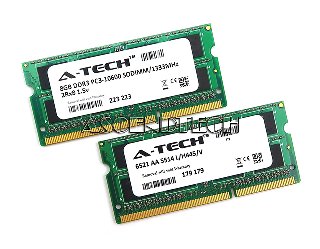 A-TECH 6521 AA 5514 L/H445/V 16GB (2x8GB) 2RX8 DDR3 SO-DIMM PC3-10600 1333MHz Laptop Memory Module 2-Piece Kit.