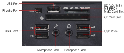 Interface Ports: RJ-45 LAN, VGA, Headphones, Microphone, HDMI, IEEE 1394, Two PS/2, Five audio, Optical SPDIF, eSATA, Nine USB 2.0 (five front, four back)