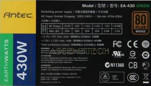 Antec EA-430 430W ATX12V / EPS12V 80 PLUS BRONZE Certified Active PFC Power Supply. Get more power and lower your electricity bill with the new EarthWatts Green series! One of the most environmentally-friendly power supplies available, the EarthWatts EA-430 Green efficiently delivers 430 Watts of reliable and stable power while meeting the Bronze level of efficiency from 80 PLUS®, the most widely recognized independent standard in power supply efficiency. On top of that, this EarthWatts Green power supply offers Universal Input to automatically work on any power grid on the planet, and a 120 mm double ball bearing fan to keep cool. Get the power you need, save money and help protect the environment with Antec EA-430 Green!