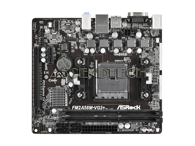 ASRock FM2A58M-VG3+ R2.0 FM2+ AMD A58 (Bolton D2) DDR3 Micro ATX Motherboard. A great foundation for you to build a FM2+/FM2 APU-based system, the ASRock FM2A58M-VG3+ motherboard delivers performance, features, and quality at a great price. It's based on an AMD A58 (Bolton D2) chipset and supports an FM2+ 95W/FM2 100W processor. This motherboard is built to be stable and durable with an all-solid-capacitor design, and a high-density glass-fabric PCB that resists humidity. Compute with confidence with Full Spike Protection that safeguards sensitive components against voltage abnormalities. Turbocharge performance with just one key with X-Boost technology. Download a variety of apps in a roundup place via ASRock APP Shop. The acclaimed ASRock XFast RAM and XFast LAN are also included for a fast, smooth experience in both local operations and on the Internet.
