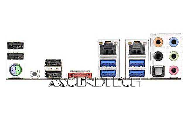 | Rear Panel I/O | - 1 x PS/2 Mouse/Keyboard Port - 1 x Optical SPDIF Out Port - 1 x eSATA Connector - 4 x USB 2.0 Ports (Supports ESD Protection (ASRock Full Spike Protection)) - 4 x USB 3.0 Ports (Supports ESD Protection (ASRock Full Spike Protection)) - 2 x RJ-45 LAN Ports with LED (ACT/LINK LED and SPEED LED) - 1 x Clear CMOS Switch - HD Audio Jacks: Rear Speaker / Central / Bass / Line in / Front Speaker / Microphone |