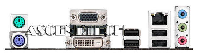 | Back I/O Ports | 1 x PS/2 keyboard (purple) 1 x PS/2 mouse (green) 1 x DVI 1 x D-Sub 1 x LAN (RJ45) port(s) 4 x USB 2.0 3 x Audio jack(s) |