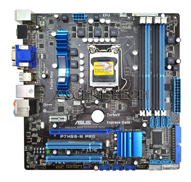 Asus P7H55-M PRO Rev.1.01G Intel Chipset H55 Socket LGA1156 uATX Motherboard. This motherboard supports the latest Intel Lynnfield and Clarkdale processors in LGA1156 package, which has memory and PCI Express controller integrated to support 2-channel (4 DIMMs) DDR3 memory and 16 PCI Express 2.0 lanes providing great graphics performance. Intel Lynnfield and Clarkdale processors are the most powerful and energy efficient CPUs in the world. Moreover, Intel Clarkdale integrated Graphics Processing Unit (GPU) processors which goes with Intel H55 chipset with VGA out can bring you to the whole new experience of the next generation VGA performance. It also provides separated 3D, 2D and Video Engines to execute different graphic control in hardware.