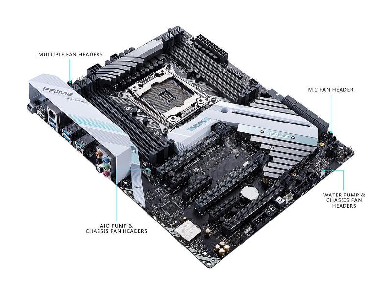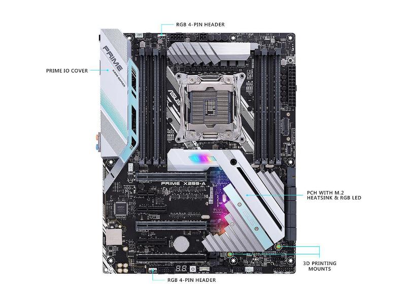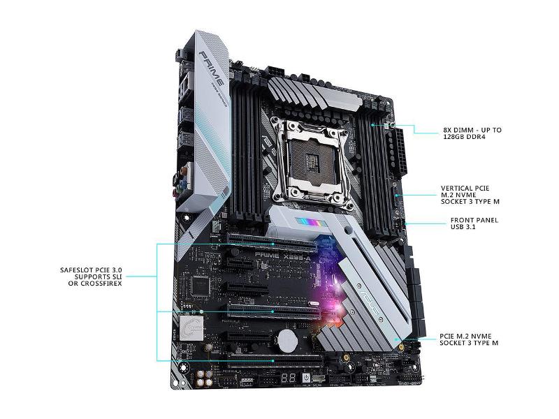 ASUS PRIME X299-A LGA2066 DDR4 M.2 USB 3.1 X299 ATX Motherboard for Intel Core i9 and i7 X-Series Processors. The ASUS PRIME X299-A is the prime choice for prosumers and content creators featuring 1-click overclocking from 5-Way Optimization, ASUS Pro Clock Technology, and multiple GPU support with SafeSlot protection. Dual M.2 and front-panel USB 3.1 deliver optimized data speeds, while AURA Sync lighting and 3D-printing mounts provide unlimited personalization.