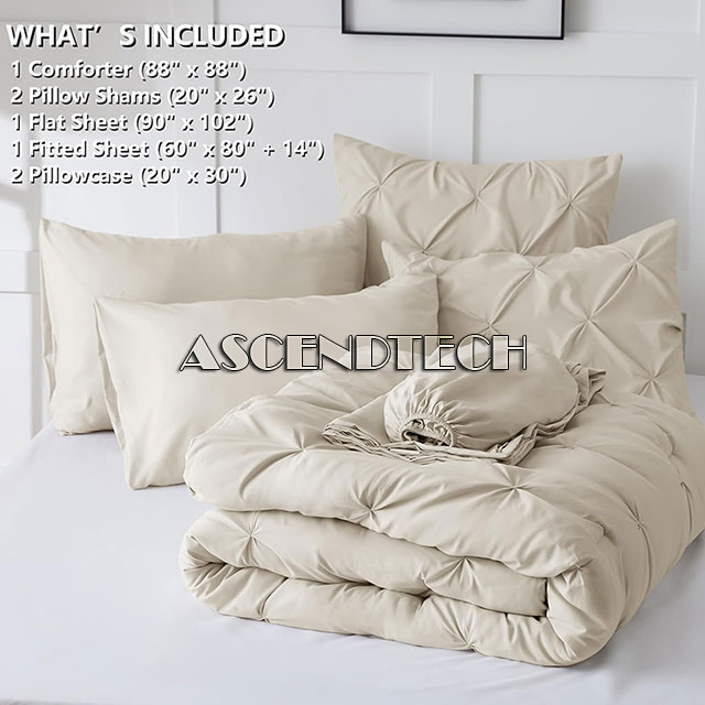 Features: Fashionable Decoration: Pinch Pleat Bed in a Bag Set create exquisite geometric patterns and look more than stunning that elevate your space with modern and noble elements. it provides timeless elegance and fashion to your bedroom decor. Soft and Breathable: The queen pinch pleat comforter sets have premium microfiber fabric which is breathable and sweat-absorbent. And also the comforter is filled with extremely soft down alternative microfiber which is friendly to those sneezing with goose down and feather bedding; Experience a fabulous night's rest with our sets. Elaborate Design: The elastic deep pocket fitted sheet fits mattress max up to 14" deep. That can always keep non-slip no matter how you twist and turn in your bed. The comforter features durable box stitching which offers sophisticated look alongside simplicity and will also stable inside filling. What You Can Get: Queen Size bed in a bag includes 1 Comforter 88"x88", 2 Pillow Shams 20"x26", 1 Flat Sheet 90"x102", 1 Fitted Sheet 60"x80"+14" and 2 Pillowcases 20"x30". Our bed in a bag is packaged in a vacuum bag, so you can dry it in low heat or tap the comforter gently while baking it in the sun to fluffy again. Easy Care: The bedding sets are machine washable which can save you more time and energy. For year round softness and prevent pilling up, it's highly recommend to wash it in the gentle cycle with cold water, sun-dry or tumble dry in low when needed. Let our comforter sheets keep providing you and your family with cozy sleeping.