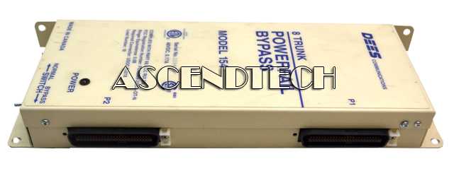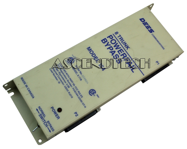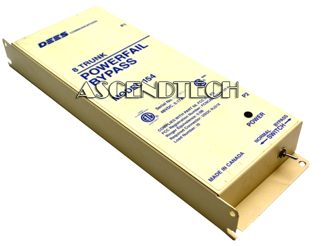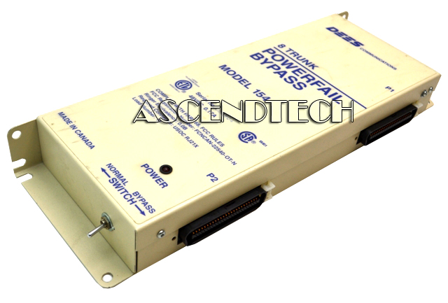Genuine Original Dees Communications 154 48VDC 0.17A 8 Trunk Station Powerfail Bypass Unit DEES154. PBX power-fail-transfer units (PFTU's) will re-direct an analog trunk to an analog phone (bypassing the PBX), allowing an analog phone to still make and receive trunk calls in the case of a PBX failure. DEES Model 154 (48VDC) provides bypass for up to 8 analog trunks during a PBX or power failure. Multiple units can be connected to handle more than 8 trunks. Units can be activated by power failure, a manual bypass switch, or a ground from a local or remote location. The Model 154 can also control auxiliary equipment via two sets of relay contacts (NO and NC). In the event of a power failure at the PBX the Bypass Interface automatically bypasses the PBX system and switches eight C.O. trunks to the preselected stations. When bypass is no longer required, a loop usage monitor circuit restores only the idle trunks. Active trunks remain in bypass mode until completion of the present call, and are then restored. Presence of power at the PBX is indicated by a red L.E.D. mounted on the front of the unit. A manual switch allows local control of the Bypass. The normal position allows control by the presence of power at the PBX, the bypass position puts all 8 channels into the bypass model. Two 25 pair industry standard Amphenol (male) connectors on the side of the unit provide all connections required for C.O. Trunks, PBX Trunks, Station Telephones and PBX Extensions.
