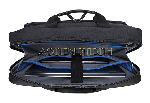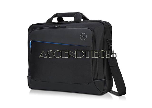 Dell Latitude 7280 7480 14" Laptop Black w/ Blue Accents Durable Professional Carrying Briefcase 3FGYM 03FGYM KH-03FGYM. The Dell Professional Briefcase 14 securely stores your 14” laptop and tablet within a dedicated plush lined laptop sleeve and tablet pocket while you’re out and about. Abundant storage compartments lets you organize and protect your everyday office essentials. Water resistant and durable materials protect your laptop and accessories from the weather while reflective accents on the bag provide increased visibility during low light commute hours. Carry the briefcase in three comfortable ways using the padded handle grabs, detachable adjustable padded shoulder strap, or the trolley strap for attaching to rolling luggage.