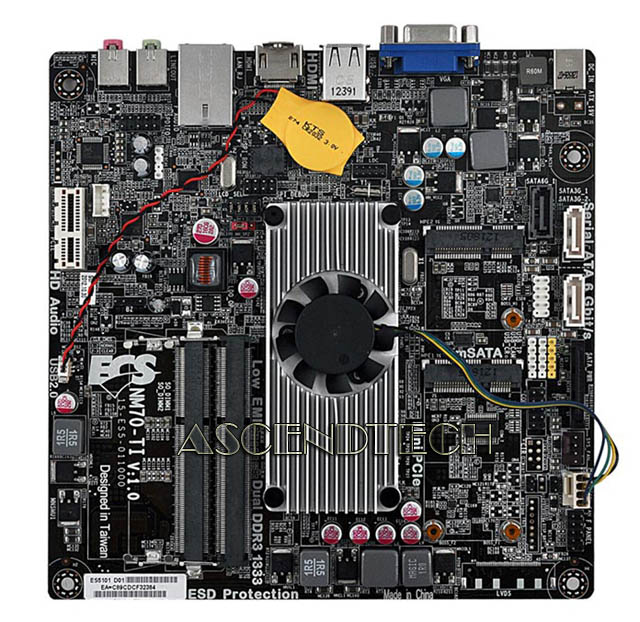 ECS NM70-TI V1.0A Intel Celeron 847 DDR3 Thin Mini-ITX Motherboard/CPU Combo. ECS NM70-TI features Applied Solid Capacitor for CPU VRM to ensure a longer lifespan for system, ESD Protection prevents computers from electrostatic discharge damage to enhance its durability and lifespan, Supports ECS EZ BIOS for tweaking BIOS in graphical user interface within a multi language environment. ECS MIB III - A friendly interface for overclocking Microsoft Windows 8 Certified. ECS meets the current and future demands of high performance, power embedded computing, making it ideal for communications, transaction terminal, interactive client, industrial automation applications as well as for standard home use.