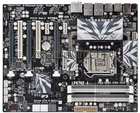 ECS P67H2-A (V.1.1) LGA 1155 Intel P67 SATA 6Gb/s USB 3.0 ATX Intel Motherboard. ECS Black Extreme Series P67H2-A motherboard is the brand new high-end LGA 1155 socket product fully supports the 2nd Generation Intel® Core i3, i5, i7 and unlocked edition K-sku desktop processors to deliver amazing overclocking capabilities.Features ECS exclusive Hydra Core technology and 3 PCI-E x16 Gen.2 expansion slots, that allows hardcore gamers to combine different models even hybrid installing different vendors of graphics cards with their unique way to get an unbelievable gaming performance. In order to improve system stability and safety, ECS P67H2-A equips all-solid capacitors, Lower RDS(on) MOSFET and ECS exclusive 15 μ technology, this enhances system durability while running at full-loading mode for a long time. ECS application kit including eOC, eGS, eSF, eBLU, eDLU and eJIFFY also offers a convenient way to extract performance, save energy consumption and keep drivers and BIOS up-to-date.