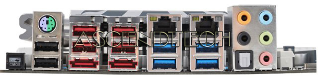 | REAR PANEL I/O | º 1 x PS/2 keyboard/mouse combo port º 2 x RJ45 LAN connectors º 1 x Audio port (Line-in, Line-out, Mic-in) º 1 x optical S/PDIF Out connector º 1 x Clear_CMOS button º 4 x USB 3.0 ports º 6 x USB 2.0 ports º 2 x eSATA 6.0Gb/s ports |