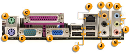 | A | PS/2 mouse port | H | Center channel and LFE (subwoofer) / retasking jack |