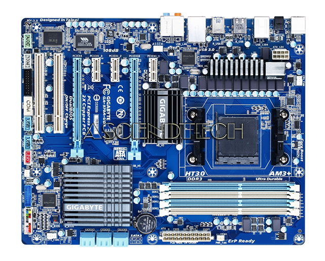 Gigabyte GA-970A-UD3 rev.3.0 AMD Chipset 970 Socket AM3+ DDR3 ATX Motherboard. With a superior graphical interface capable of 32-bit color imaging and fluid user-friendly mouse navigation, UEFI DualBIOS makes BIOS configuration a new and exciting experience for novice and experienced users alike. UEFI BIOS also brings native support for large hard drives on 64-bit operating systems.