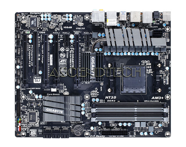 Gigabyte GA-990FXA-UD3 rev.4.0 AMD Chipset 990FX Express Socket AM3+ DDR3 ATX Motherboard. The 990FXA-UD3 motherboard is designed to offer a stable, high-speed platform for delivering amazingly fast data transfer via the GIGABYTE 333 onboard acceleration technologies. Featuring the USB3.0 controller, AMD 900 series motherboards allow users to take advantage of super fast USB transfer rates of up to 5Gbps, delivering 10x faster data transfer compared to USB 2.0. Utilizing the industry's first Serial ATA Revision 3.0 solution via AMD SB950 chipset, GIGABYTE AMD 900 series motherboards offer native 6 ports of next generation high speed data storage devices support with data transfer speeds of up to 6 Gbps with RAID 0, 1, 5, 10. The AMD 900 series motherboards introduce a unique hardware design with lower resistance fuses for ensuring lower voltage drops and providing more stable and plentiful power delivery. All USB ports also benefit from a 3x power boost for better power delivery to power hungry USB devices.