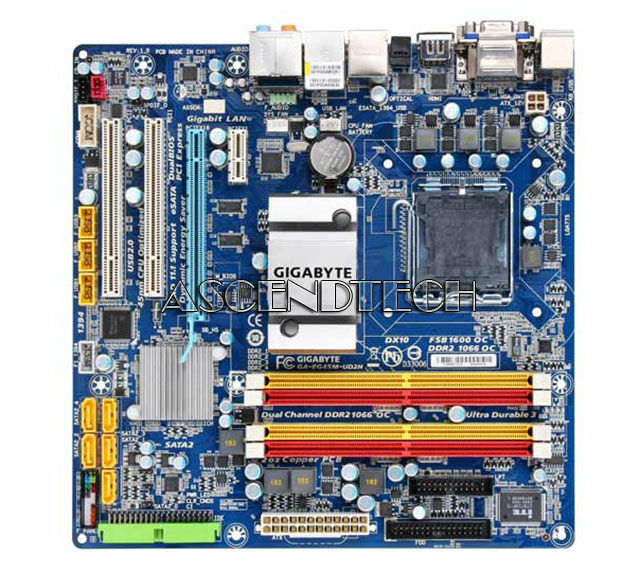 Gigabyte GA-EG45M-UD2H rev.1.0 Intel Chipset G45 Socket LGA775 DDR2 Micro ATX Motherboard. The GA-EG45M-UD2H based on the Intel G45 chipset supports the latest Intel 45nm CPUs and integrates support for HDMI, DVI and HDCP, creating a powerful multi-media platform which allows users to do more at once. At the heart of the Intel G45 Express chipset is the Intel X4500HD graphics media accelerator, which features several unique innovations including more Execution Units for enhanced 3D performance and Intel Clear Video Technology for sharper images and precise color control. The G45 chipset also supports smoother HD video playback, and includes support for Blu-ray and HD-DVD formats, thanks to built-in hardware video decode acceleration. The GA-EG45M-UD2H introduces revolutionary GIGABYTE Ultra Durable 3 technology featuring a 2 oz copper PCB to help reduce system temperature and dramatically enhance performance.