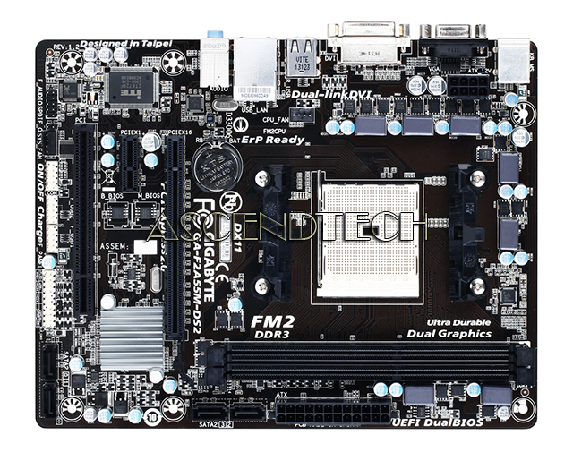 Gigabyte GA-F2A55M-DS2 rev.1.2 AMD Chipset A55 Socket FM2 DDR3 Micro ATX Motherboard. The revolutionary GIGABYTE 3D BIOS application is based on GIGABYTE UEFI DualBIOS technology and is available to consumers in two exclusive modes of interaction, providing enthusiast and mainstream users with a choice of unique and powerful graphical interfaces.