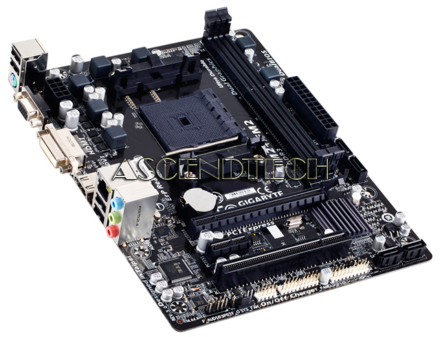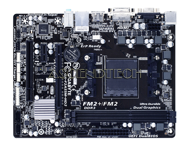 Gigabyte GA-F2A55M-HD2 rev.3.0 AMD Chipset A55 Socket FM2+ DDR3 Micro ATX Motherboard. GIGABYTE FM2+ series motherboards based on AMD A55 chipset and feature the new FM2+ APU socket, and are designed to get the most from forthcoming Kaveri AMD APUs, while preserving compatibility for current AMD FM2 APUs. FM2+ AMD APUs offer native support for 8 GT/s PCI Express gen 3.0 as well as DX11.1 support integrating the high performance ‘Steamroller’ core. AMD socket FM2+ APUs also offer native support for 4K resolution displays on HDMI port.