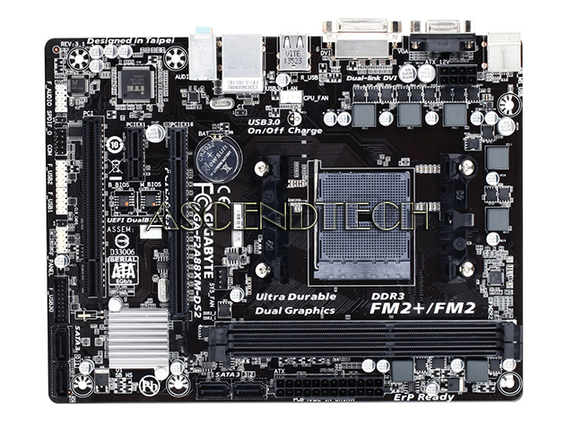 Gigabyte GA-F2A88XM-DS2 rev.3.0 AMD Chipset A88X Socket FM2+/FM2 DDR3 Micro ATX Motherboard. GIGABYTE Ultra Durable 4 Plus debuts on GIGABYTE motherboards, with a range of features and component choices that provide record-breaking performance, cool and efficient operation and extended motherboard lifespan.