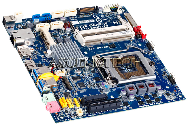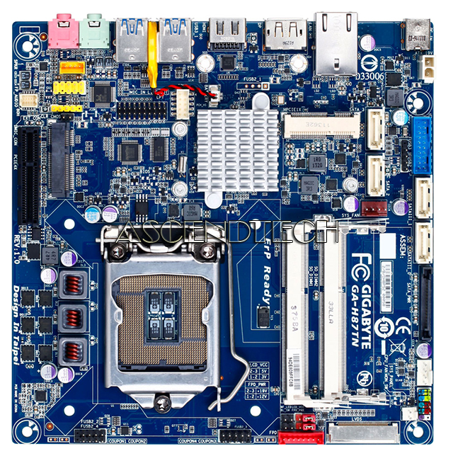 Gigabyte GA-H87TN rev.1.0 Intel Chipset H87 Express Socket LGA1150 DDR3 SO-DIMM Thin Mini-ITX Motherboard. GIGABYTE Thin-Mini-ITX motherboards are the ideal platform for today’s All-in-One, small form factor and slim profile PCs. Offering a full featured PC experience in a minimal device footprint, GIGABYTE Thin Mini-ITX motherboards are 43% thinner than traditional Mini-ITX designs. Complying with the latest Thin Mini-ITX guidelines, GIGABYTE Thin Mini-ITX motherboards offer additional flexibility making them suited to broad range of innovative PC designs.