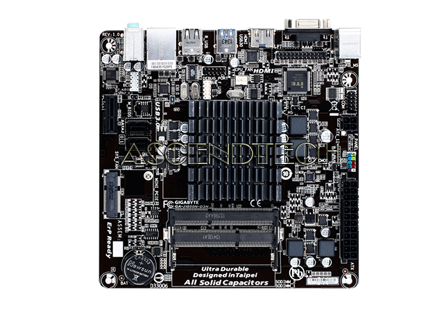 GIGABYTE GA-J1800N-D2H Rev.1.0 Intel Celeron J1800 2.41 GHz Dual-Core Processor DDR3 SATA 3Gb/s Mini-ITX Ultra Durable Motherboard. The GIGABYTE J1800N Mini-ITX motherboard is a fully integrated PC motherboard featuring the Intel® Celeron™ J1800 dual-core processor. Designed for compact, small form factor PC systems and devices, the GIGABYTE J1800N is entirely fanless, making it ideal for always-on, mission critical systems, as well as noise-sensitive digital entertainment systems. Connectivity includes digital and analog display outputs via VGA and HDMI ports, while a Mini-PCIe slot provides flexible Wi-Fi option.