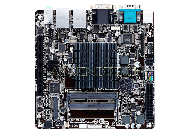 GIGABYTE GA-J1900N-D3V Rev.1.0 Intel Celeron J1900 Quad-Core 2.0 GHz Processor DDR3 SATA 6Gb/s Mini-ITX Motherboard. The GIGABYTE J1900N Mini-ITX motherboard is a fully integrated PC motherboard featuring the Intel® Celeron™ J1900 quad-core processor. Designed for compact, small form factor PC systems and devices, the GIGABYTE J1900N is entirely fanless, making it ideal for always-on, mission critical systems, as well as noise-sensitive digital entertainment systems. Connectivity includes digital and analog display outputs via DVI-D and VGA ports, while a Mini PCI-E slot provides flexible Wi-Fi option and a PCI slot provides wide-range expansion card selections.