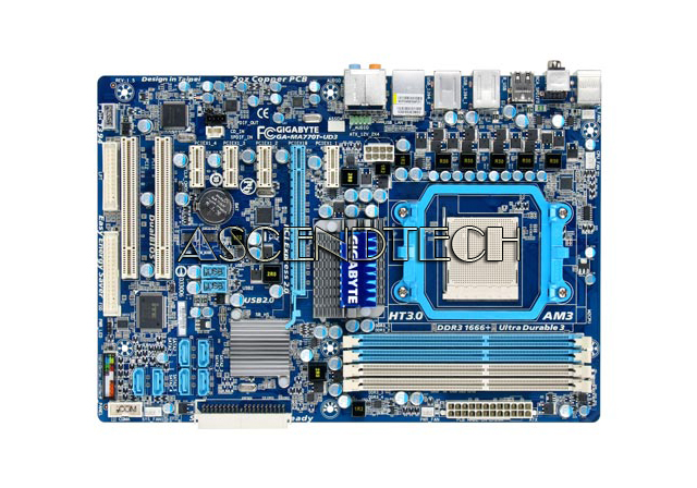 Gigabyte GA-MA770T-UD3 REV:1.5 AMD Chipset 770 Socket AM3 DDR3 ATX Motherboard. The GA-MA770T-UD3 introduces revolutionary GIGABYTE Ultra Durable 3 technology on latest AMD socket AM3 platform with featuring 2 oz copper PCB and further helps to reduce the system temperature and dramatically enhance the performance. Based on AMD 770 chipset, the GA-MA770T-UD3 supports new generation of 45nm AMD AM3 Phenom II/ Athlon II processors, integrated DDR3 memory controller, HyperTransport 3.0 technology links and PCI Express 2.0 graphics interface support. With the innovative GIGABYTE Easy Energy Saver technology, the GA-MA770T-UD3 is able to provide user friendly computing, reach the maximum system performance easily while still able to save the power and environment in real life at the same time.