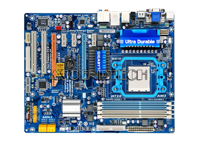 Gigabyte GA-MA790GPT-UD3H rev.1.0 AMD Chipset 790GX Socket AM3 DDR3 ATX Motherboard. The GA-MA790GPT-UD3H introduces revolutionary GIGABYTE Ultra Durable 3 technology on AMD platform with featuring 2 oz copper PCB and further helps to reduce the system temperature and dramatically enhance the performance. Based on AMD 790GX chipset, the GA-MA790GPT-UD3H supports the latest 45nm AMD AM3 Phenom II / Athlon II processors, integrated DDR3 memory controller, HyperTransport 3.0 technology links and dual PCI Express 2.0 graphics interfaces (running at x8 and x8) for ATI CrossFireX / ATI Hybrid CrossFireX support. With the innovative GIGABYTE Easy Energy Saver technology, the MA790GPT-UD3H is able to provide user friendly computing, reach the maximum system performance easily while still able to save the power and environment in real life at the same time.