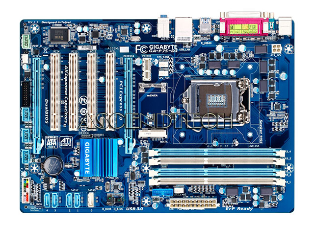 Gigabyte GA-P75-D3 rev.1.0 Intel Chipset B75 Express Socket LGA1155 DDR3 ATX Motherboard. GIGABYTE 7 series motherboards take advantage of the latest connectivity and expansion bus technologies available on the Intel platform. The 3rd generation Intel Core processor platform debuts the new PCI Express gen. 3.0 expansion bus, allowing users to take advantage of the next generation, high-bandwidth discrete graphics card solutions. * PCIE Gen.3 is dependent on CPU and expansion card compatibility.