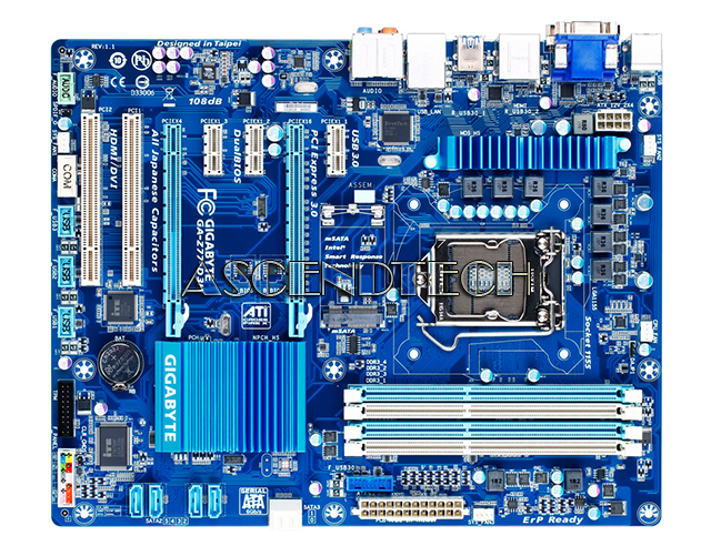 Gigabyte GA-Z77-D3H rev.1.1 Intel Chipset Z77 Express Socket LGA1155 DDR3 ATX Motherboard. GIGABYTE 7 series motherboards combine a host of new and exciting technologies with the latest Intel Z77 Express Chipset, creating a unique range of motherboard designs that harness the outstanding performance of the new 3rd generation Intel Core processors. With an exclusive 'Digital' VRM design, GIGABYTE 3D Power and GIGABYTE 3D BIOS (Dual UEFI), GIGABYTE 7 series motherboards ensure exceptional power delivery and absolute control, with additional features that ensure an unrivalled experience on your next PC build.