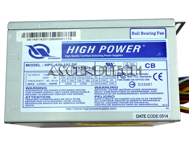 High Power HPC-420-102 DF 420W ATX12V2.0 Ball Bearing Fan Active PFC PSU Power Supply. keep your system as quiet as possible with High Power's silent PC power supplies, the ultimate solution for computer noise reduction. Pioneer of Automatic Fan Speed Control (A.F.C.) with built-in temperature sensor control technology makes High Power Silent Power Supplies 3x quieter than the average generic power supply.