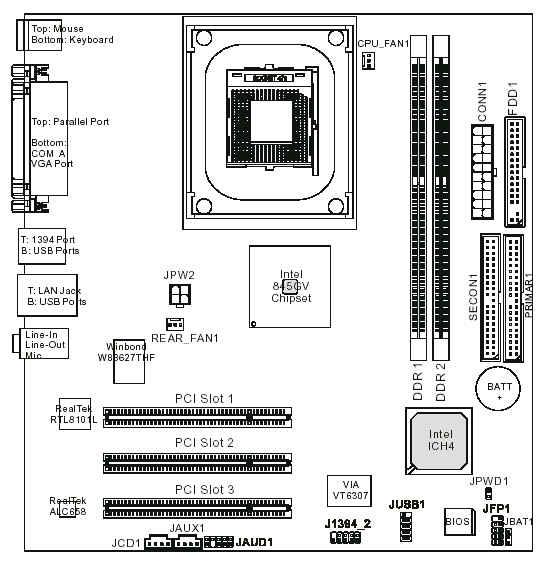 Onboard Peripherals | Two PS/2 ports Six USB ports (four front, two rear) One Parallel port One Serial port One VGA Two IEEE 1394 (one front, one rear) One RJ-45 LAN port Vertical audio ports (line-in, line-out, microphone-in) |