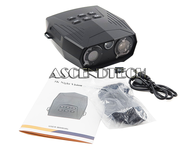 Features: 5K Video, 60MP Images, 10x Digital zoom, 9 Levels IR, Aperture: F1.0 f=25mm, Lens Angle: FOV 12° diameter: 25mm, Day/Night Use, Anti Reflective Lens, Built-In Flash, Compact Design, High Magnification, Lightweight, Manual focus wheel, Anti-shake, Tactical light. 1x USB Type-C to Type-A cable, 32GB TF Card, 1x Neck Strap, Manual