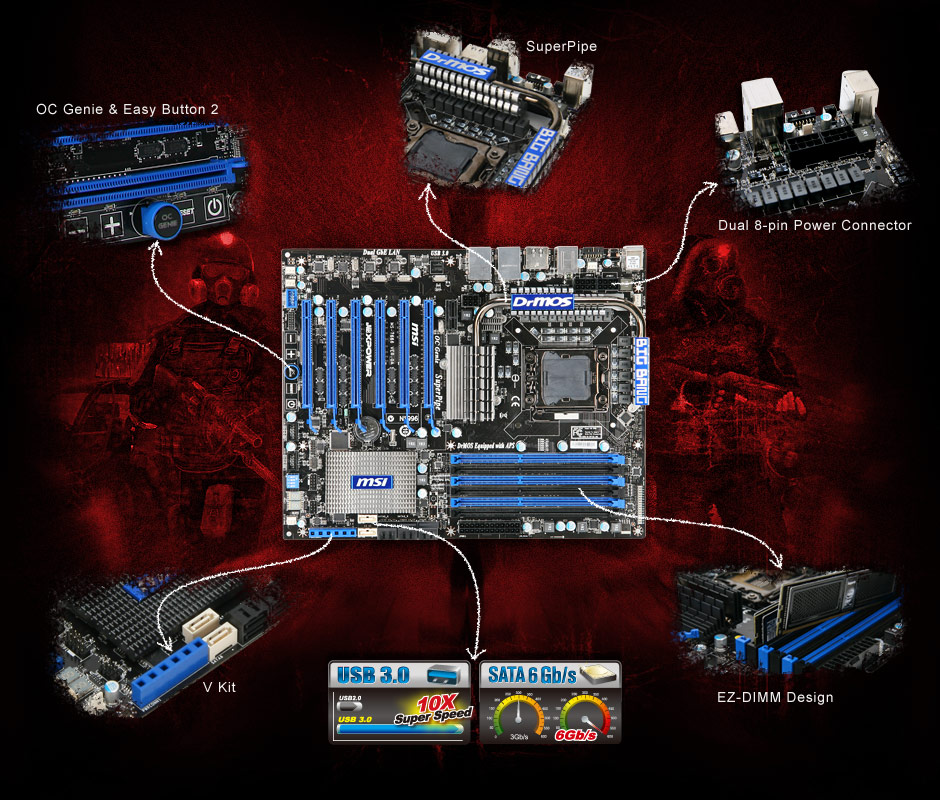 Built with Military Class component, the Big Bang–Xpower provides outstanding stability, incredible long lifespan and superior overclocking capability running at low temperature. Besides stunning features, like server-grade Hi-c Cap & SFC (Super Ferrite Choke) on PWM, SuperPipe, DrMOS and OC Genie, the Big Bang–Xpower is shipped with 6 PCI Express 2.0 slots with CrossFire and 3-way SLI support to build the ultimate gaming platform. Furthermore, MSI adds the Quantum Wave audio processing, THX TruStudio PC and Creative’s EAX Advanced HD 5 to the board to meet the audio demands of PC games and PC/HTPC-HIFI.