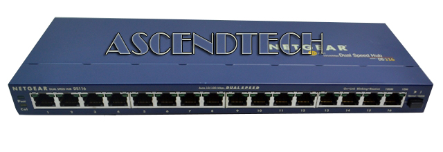 Genuine Original Netgear DS116 16-Port 10/100 Dual Speed Hub. The NETGEAR Model DS116 Dual Speed Hub is network hub that enable users to mix and match 10 and 100 megabit per second (Mbps) devices on the same network. This capability eliminates the high cost and complexity of separate network equipment for 10 and 100 Mbps users. These four hubs, also known as the DS100 Series hubs, are ideal for small networks in transition from 10 to 100 Mbps and for linking networks operating at different speeds. All four hub models connect PCs to share printers, files, Internet access, and email communications. Each network port coordinates with the connected PC to run at 10 or 100 Mbps, making network configuration and upgrade effortless. In addition, the 10 and 100 Mbps network segments are internally bridged to form one network, providing full connectivity among all users.
