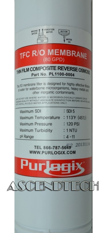 Purlogix Thin Film Composite Reverse Osmosis Membrane (80 GPD) Cartridge Filter for Purlogix Water Cooler. Purolex Part Number: PL1100-0004. This RO membrane filter is designed for highly effective filtration of water for waterborne microorganisms, heavy metals and other inorganic contaminants.