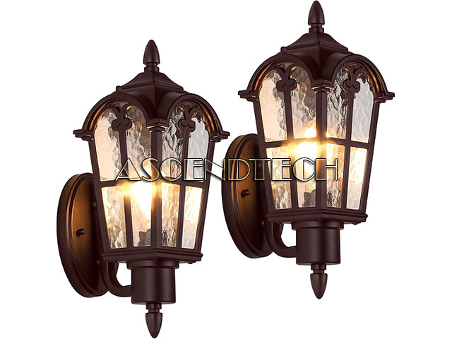 Features: Weather Resistance: Sucolite outdoor wall lights are built to last, featuring the sturdy metal frame and thickened glass shade that make it waterproof and able to withstand any weather condition, including sun, snow, rain, and ice. The high-quality metal used in the construction effectively prevents rust and corrosion, enabling it to retain its stylish appearance for years of use. Retro Design: The outdoor light fixture has a sophisticated Victorian and farmhouse style thanks to the retro top cover finished in brown. The water ripple glass shade is unique and creates a stunning lighting effect, casting a fabulous pattern on the wall. Perfect for any exterior space of the house, including the porch, garage, yard, entryway, and front door, adding a touch of elegance and beauty. E26 Sockets: Two E26 base bulbs are needed when using these 2-pack porch lights and any E26 medium base bulbs like CFL, LED, halogen, and incandescent bulbs are compatible. ST58/ST64 LED Edison bulbs or incandescent bulbs are highly recommended if you want to enhance the vintage flair. The maximum wattage for incandescent is 100W and 8W for LED(bulb not included). Easy Installation: The glass shades of the exterior wall lanterns are pre-assembled when you receive and the package comes with the detailed instructions and hardware accessories for fast and easy installation. We advise you contact professional electricians to install for safety purpose. Great Value: The stunning optical design imbues your outdoor area with a renewed and inviting ambiance, even when the light is off. The light diffuses in all directions, illuminating the surroundings brightly. Each outdoor wall light is crafted from high-quality materials and undergoes thorough testing to ensure durability. These lights are not only decorative and functional but also long-lasting, making them the ideal lighting solution